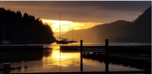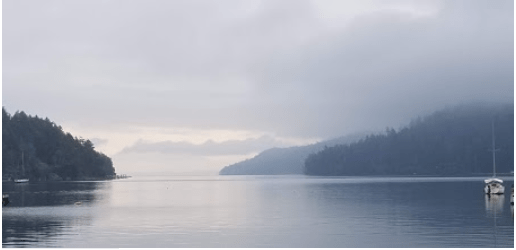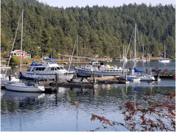 We arrived at Port Browing after a leisurely 15 mile passage from Sidney on the auspicious afternoon of October 31st. Our plan is to stay here for the month of November, and move over to Victoria for December, and if all goes well this monhth we will come back to Port Browning for January-March. During the passage from Sidney, there were a few mild areas of turbulence where differing currents met and comingled, but for the most part we had timed the passage for the currents to give us a push. Twas good planning… As you can see from the photo below as we neared Point Fairfax, Moresby Island (on the left side of the picture), and South Pender Island can be seen in the misty distance just behind it (about 4 miles further). The island on the right is Stuart Island, in the USA where Reid Harbor and Prevost Harbor are lovely anchorages. As you can see, the seas were flat and there was no wind to speak of. Now that sailing is in our near past… that is how we like it!