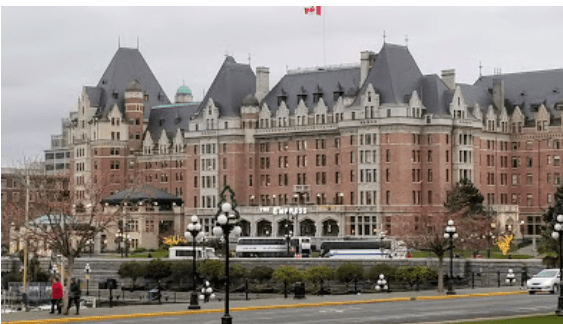 This is the view through our pilothouse windows: The Empress Hotel. The Causeway Marina sits right in front of this world famous hotel.