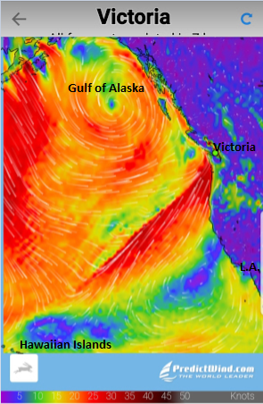 Back to the Pineapple Express. A snapshot of a PredictWind program screen shows what that means from a meteorological viewpoint. The band of red between the Hawaiian Islands and Northern California up to Vancouver Island demonstrates where the Express is at 1600 12/19/19. Victoria appears to be at the bitter end of the torrent… and we are getting a bit of wind and rain as I type. I would not want to be off the coast of Oregon or Washington right now. Out there the wind is blowing steadily in the high 30’s with gusts in the mid 50’s. The average ocean swell is in the 18 foot range with wind waves on top of that. It is ugly weather for a small boat… a barfOrama and quite dangerous for the ill prepared. Within 3 days or so the Express will be shifting to the South and will hit California all the way to San Diego. Predictable fun for all to share…