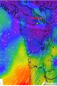 They call it a pineapple express. It arises around the Hawaiian Islands and comes like a freight train filled with water and hits the North American coast causing windy conditions and dumping lots of rain. I’m not a meteorologist and I don’t even play one anywhere that it might matter. I’m just stating the facts ma’am. And we all know that facts now can be misleading at times depending on perspective. Anyway, a fitting moniker, Pineapple Express might be explained by reviewing the screen shot below. All I’m doing is looking out the window right now and watching the williwaws dance across the inner bay between our snug boat and the Parliament Building with all of its Christmas lighted splendor.