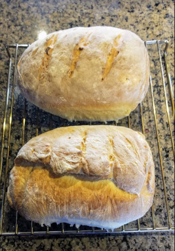 The flour sat there for a day or two, then came the craving. Fresh baked bread. After searching for a good recipe I picked one for “artisan” bread. There’s nothing special about the “artisan” part, except you don’t need to have bread pans to bake it. I don’t have any and will not go to the store to find some. Social distancing is a perfectly good reason to not spend the money and then find a place to store the damn things. So… I proofed the yeast, added the requisite sugar, salt, and warm water to the bowl… serially added about 5 cups of flour to the mess while stirring and prodding it into a dough… dumped it all out onto a floured surface (that would be my cleaned and disinfected countertop), kneaded it into submission as described, and plopped the resulting dough ball back into the bowl. I draped a damp towel over it’s soon to rise head, and let it rise for 2 hours back in our enclosed cockpit that gathers and stores the suns rays, providing a nice warm environment even when it is cold outside (and not raining).