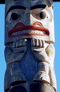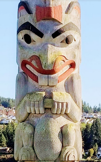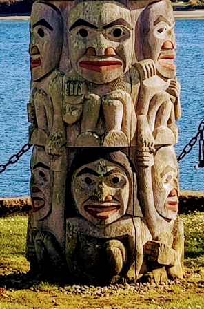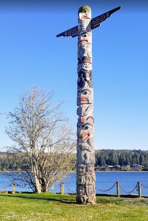 The pole depicts the evolution of Port Ludlow from its past natural state to its present as a residential community, arrayed in six Tsimshian figures.
