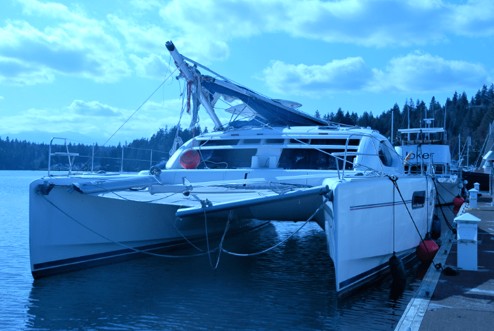 We’ve been under the bridge now about three times. It spans a narrow waterway called the Port Townsend Ship Canal which separates the mainland at Port Hadlock from Indian Island, home of the Indian Island Naval Reserve, which is a major US Navy munitions handling facility. But this story is not about Indian Island. It is about the Canal, a fifty foot catamaran, an old wooden boat named of all things, Joker, and a Bridge with a height of 58 feet above high water. I think you can just sense where this little tale is going…