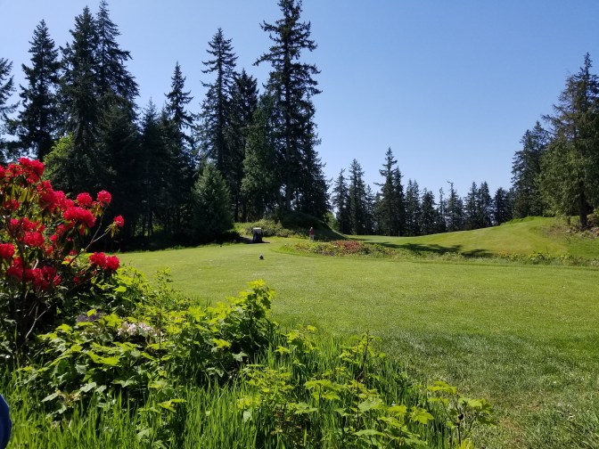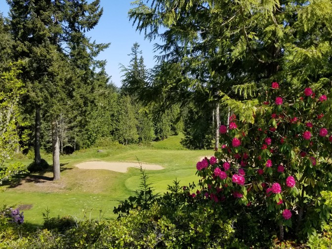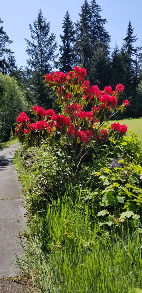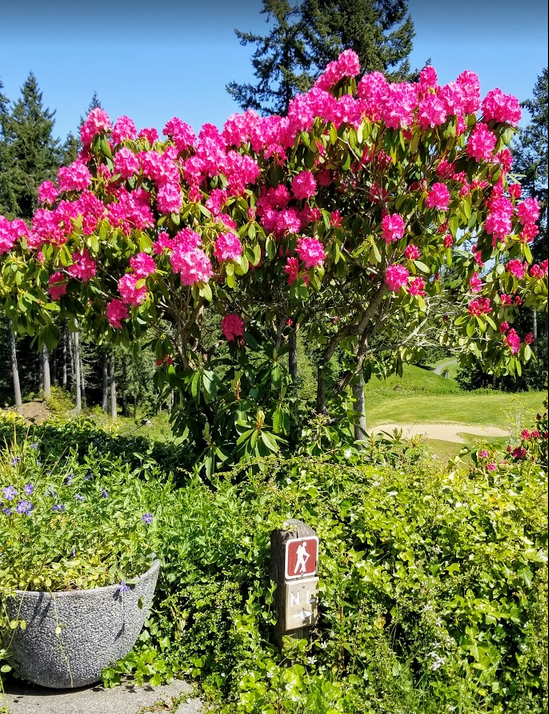 At the time of this hike on the 5th of May, the beginning at the club is stunning with rhododendrons of every color in bloom surrounding the verdant, wooded greens of the course. Many of the forest trees and shrubs encountered throughout the hike are flowering as well…