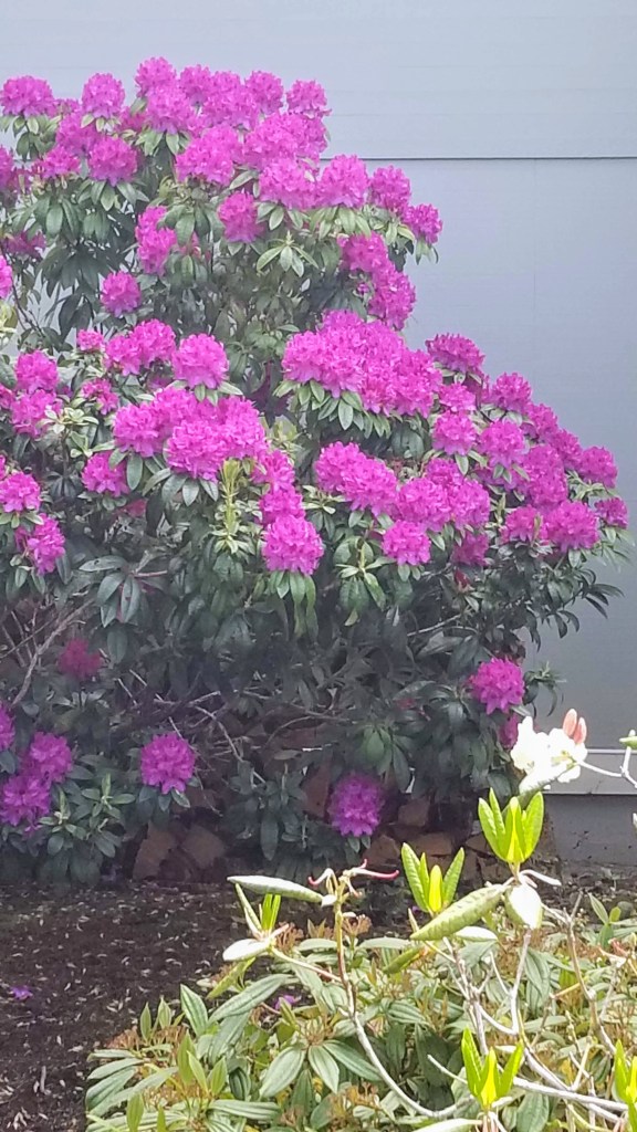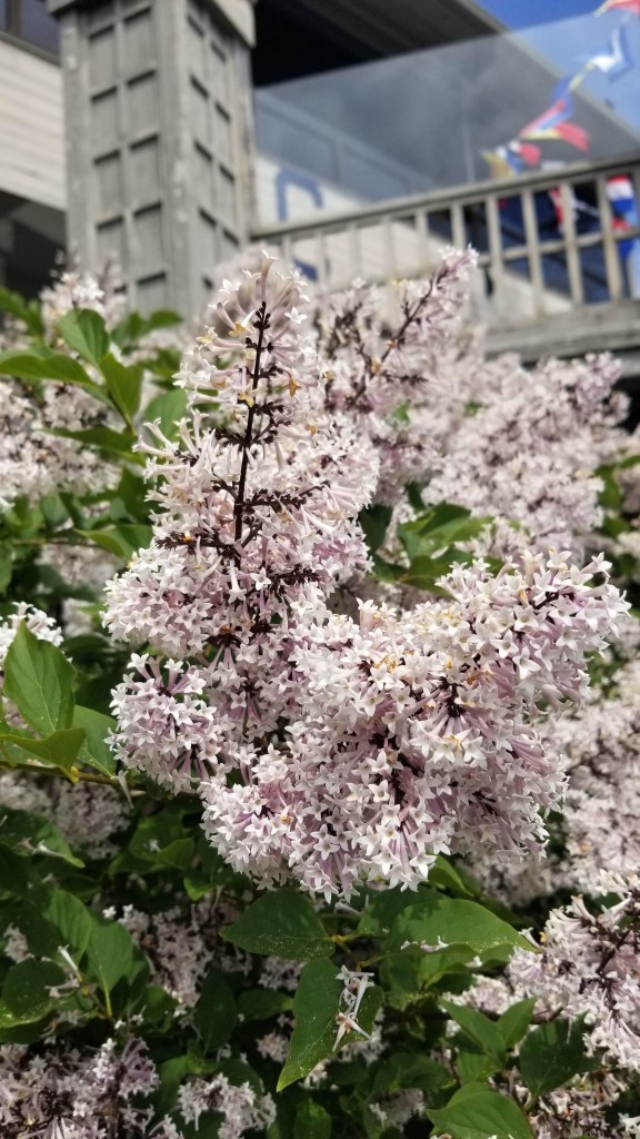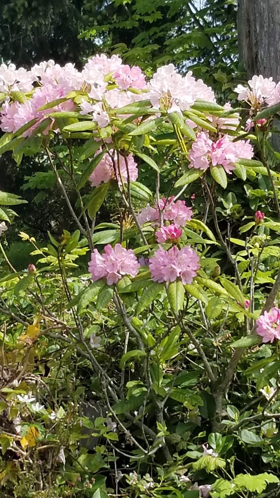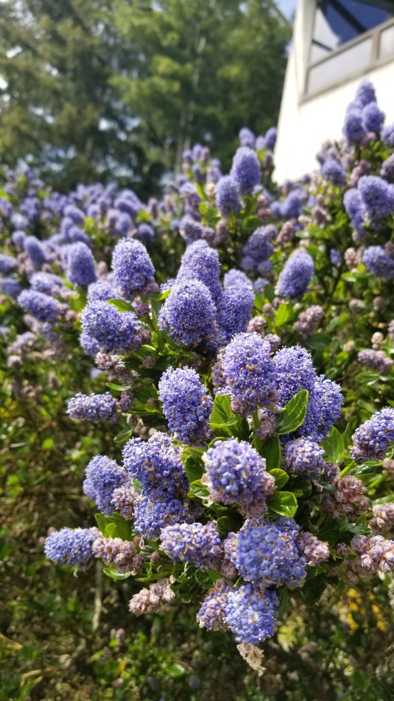 We started our May 24th sojourn from the docks of the marina, traipsed across the pond on the floating bridge that leads to the Port Ludlow Yacht Club, and wandered the streets of the Village for a bit before entering the first of 4 trails, The Rainier Loop. Many of the well landscaped bushes and trees are in full bloom spewing out pollen, pheromones and other olfactory enticements for insects and humans alike. The first blooms we saw were covering a ceanothus “concha” or California Lilac next to the Club.