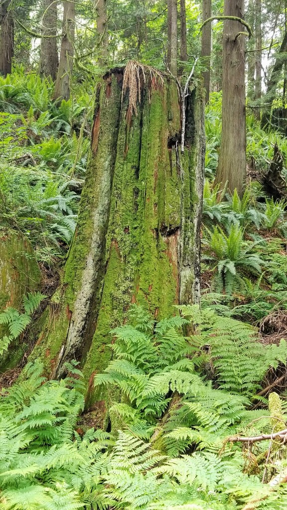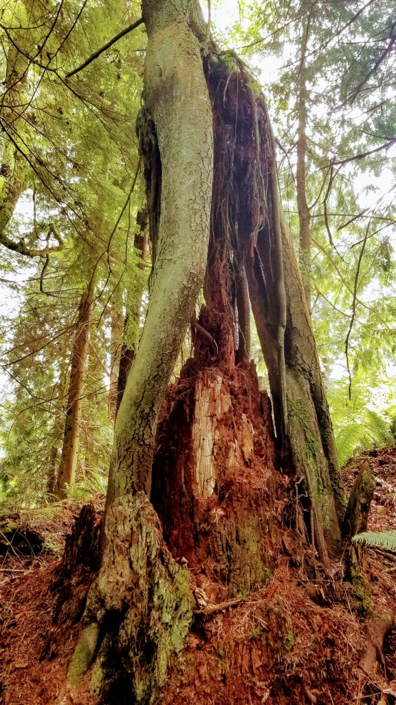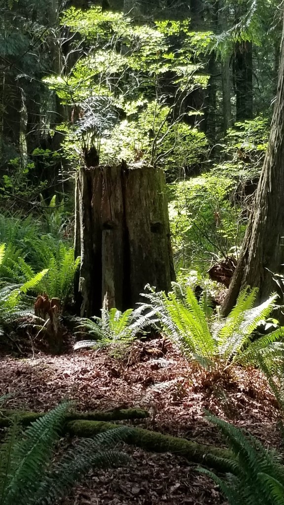 The next series of pictures capture some of the interesting ways that the seedlings of deciduous trees sometimes use stumps as their base for growing. Perhaps doing so offers up some advantages in the beginning of their lives. Obvious ones might be to place their tender emerging leaves out of the reach of hungry deer, and the stumps provide needed nutrients. But as the stump slowly decays and returns to humus, the structures that remain may not be strong enough to support the tree as it grows taller and heavier. As it reaches towards the sky, and starts to develop a larger crown of branches and leaves, the effects of wind and gravity become more important components of structurally stability. What seemed like a good strategy when it was young and protected from wind and marauding deer folk, becomes a dangerous liability as it’s base of support withers and continues to decompose. Seedling trees employing this tactic will most likely end their lives before maturity.