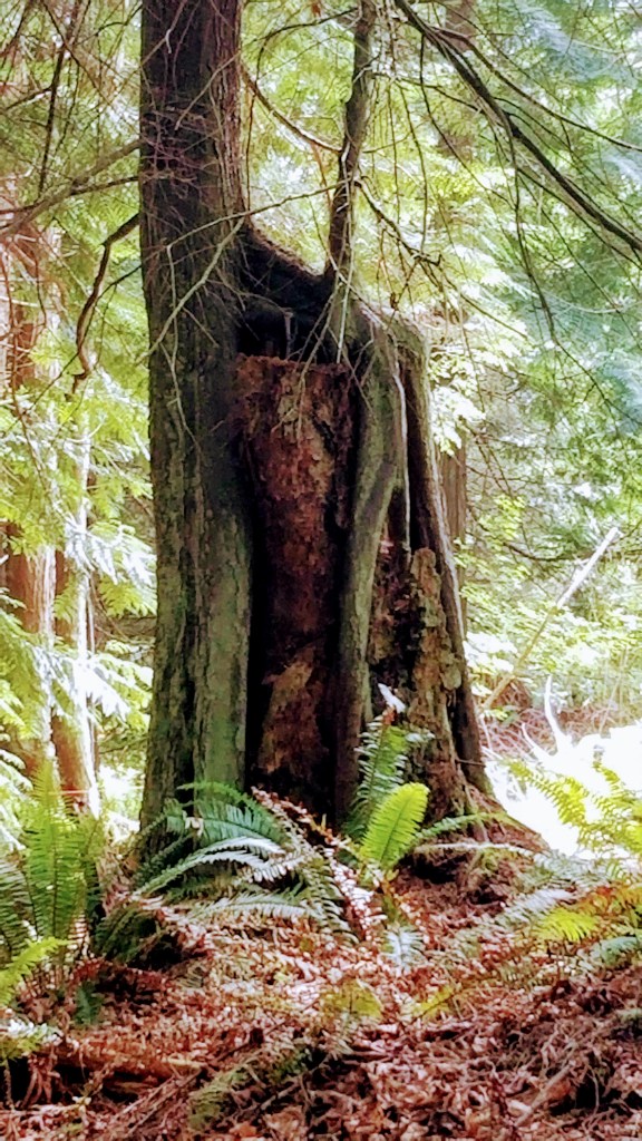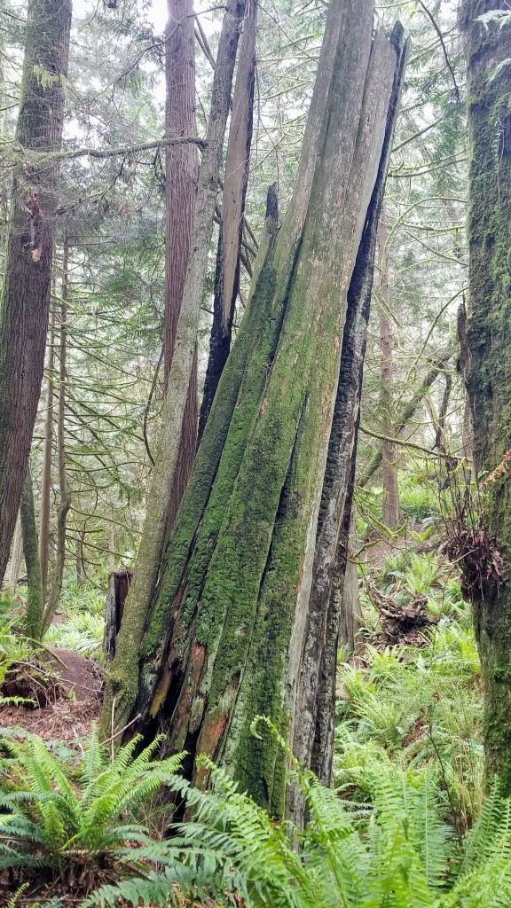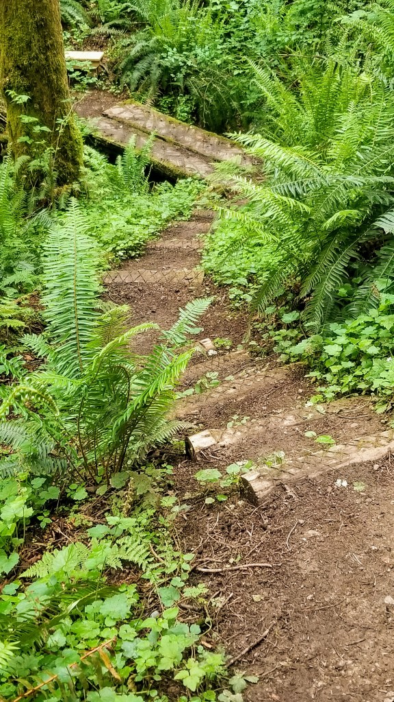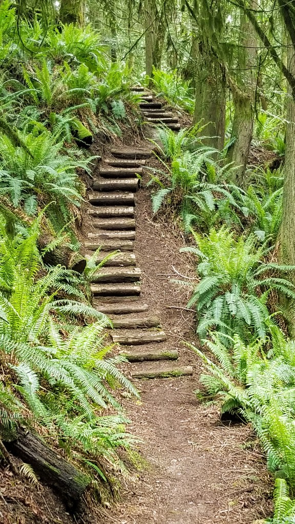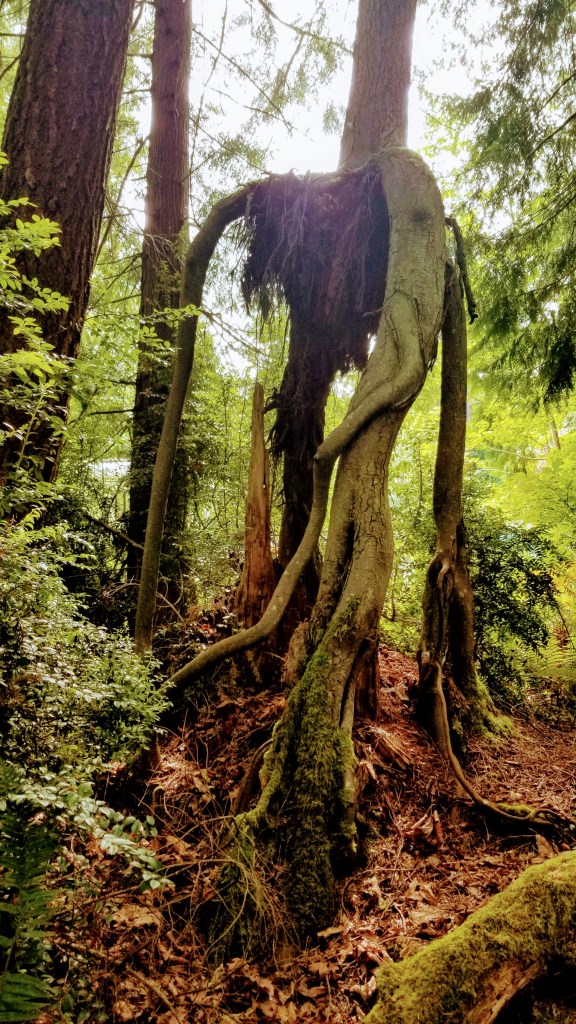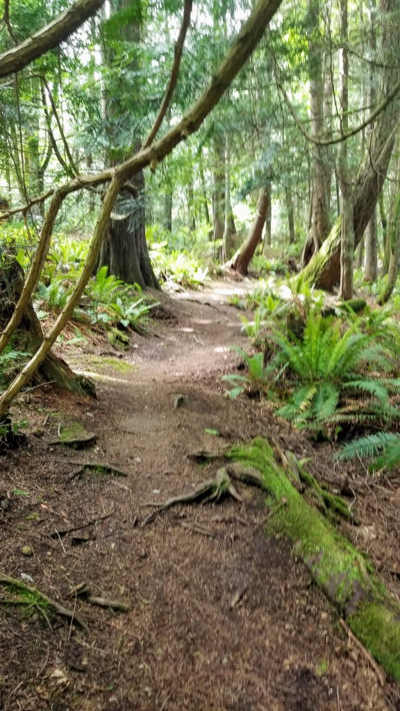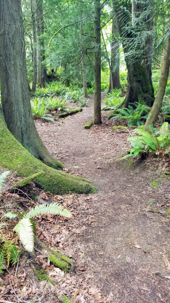 We left the residential area, crossed Oak Bay Road and entered the the Rainier Loop Trail. It was the first of the 4 linked trails we planned on hiking. It meanders slowly uphill and loosely follows the course of a seasonal crick as opposed to a creek, the difference being that a crick is something easily stepped over, whereas a creek requires a bit more ingenuity to cross. My definitions, not Websters…