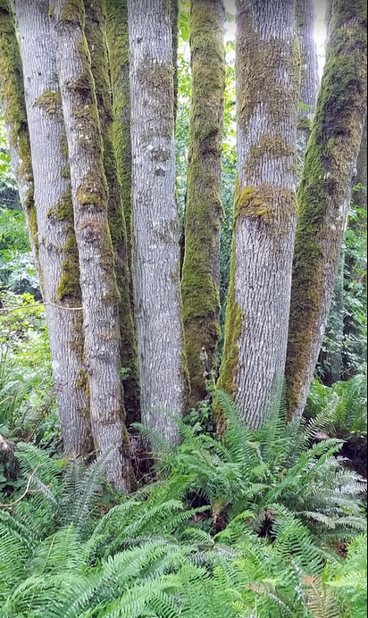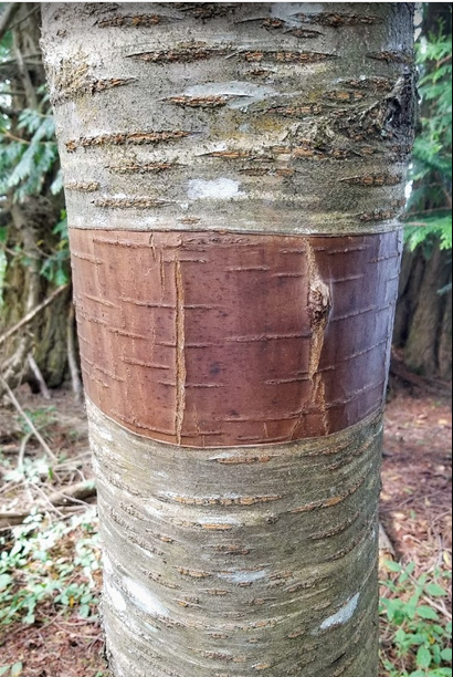 Now this is a bit of an odd duck. It is a red alder. Someone determined that it was a good idea to peel its bark off. It’s called girdling and usually results in the death of the tree. I’m not sure what the tree did to them to cause such an evil revenge. In this case, whoever the evildoer was, did not go deep enough into the cambrium. So… the tree is in the process of healing its dastardly wound. The new bark seems to be filling in and the tree may well survive. Interesting to see this just off a forest trail, and not in the path of a construction zone, a future home site etc.