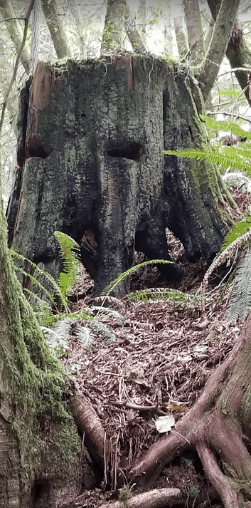 This is a dark and forboding sight that greets the hiker upon entering the Rainier Trail in Port Ludlow. The notches are hacked into the tree to support what are called springboards.
