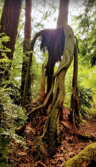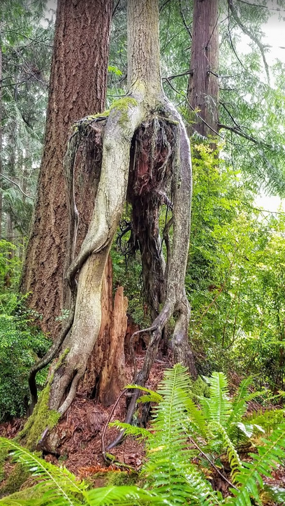 The answer is in the tree that is growing behind it and too the left. It grew over a very old stump. The stump of the tree that was there 100 or more years earlier. The older tree that was blocking the light of the younger tree eventually was either logged or fell down in a wind storm. It was so long ago that you can’t trace where the tree might have fallen and integrated back into the forest floor. The smaller tree grew over the old stump. It is not as precarious as the Imperial Walker, but is still not a good strategy, nor is the closer tree that has such a nice swooshy trunk. Neither are set up to live as long as they might have if growing on firmer ground.