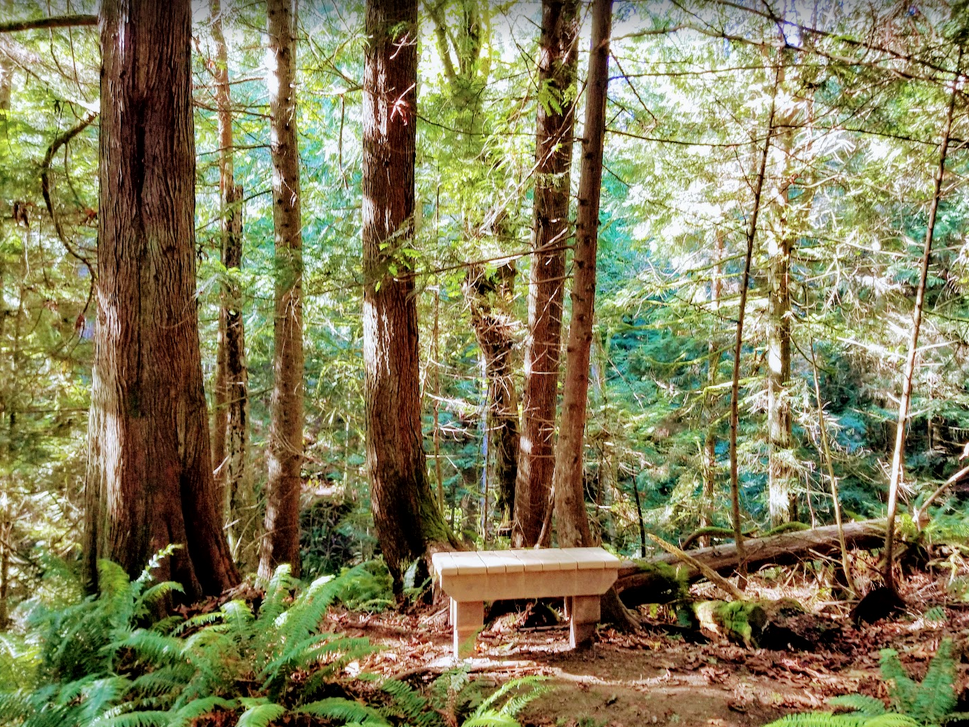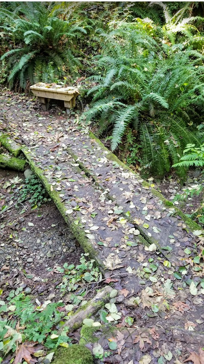 As the trail reaches bottom of the ravine, there is a split log “bridge” that spans the seasonal creek that runs through it. It’s a bit wetter down here and the resting bench is not as inviting.