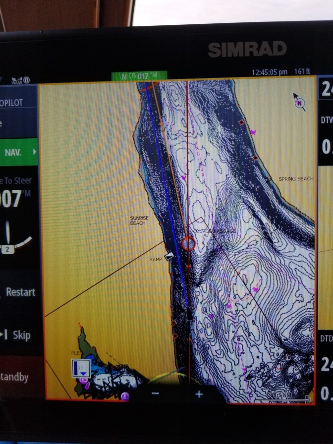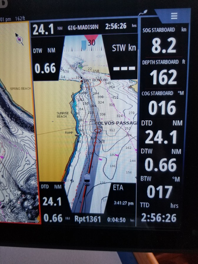 In addition to paper charts and a compass, which are always good backups to have around, we have 2 chart plotters, two radars, 2 depth sounders and multiple instruments that tell us what is going on “out there”, where we are at all times, what the current is doing to us, and importantly, 2 very good stabilizing binoculars so all can be visually verified. We never rely upon one system to tell us all of that information, best to have several, but never one. For charting… we have the two chart plotters, 2 independent smart phones with navigation charting software, 2 tablets with independent navigation software and a laptop with a powerful charting system. If all fails we can use Google maps.