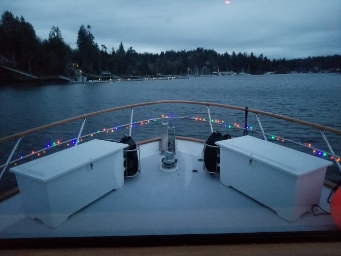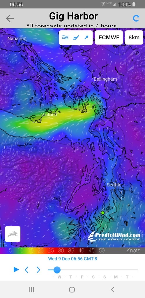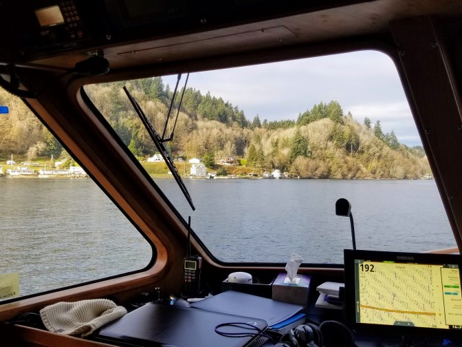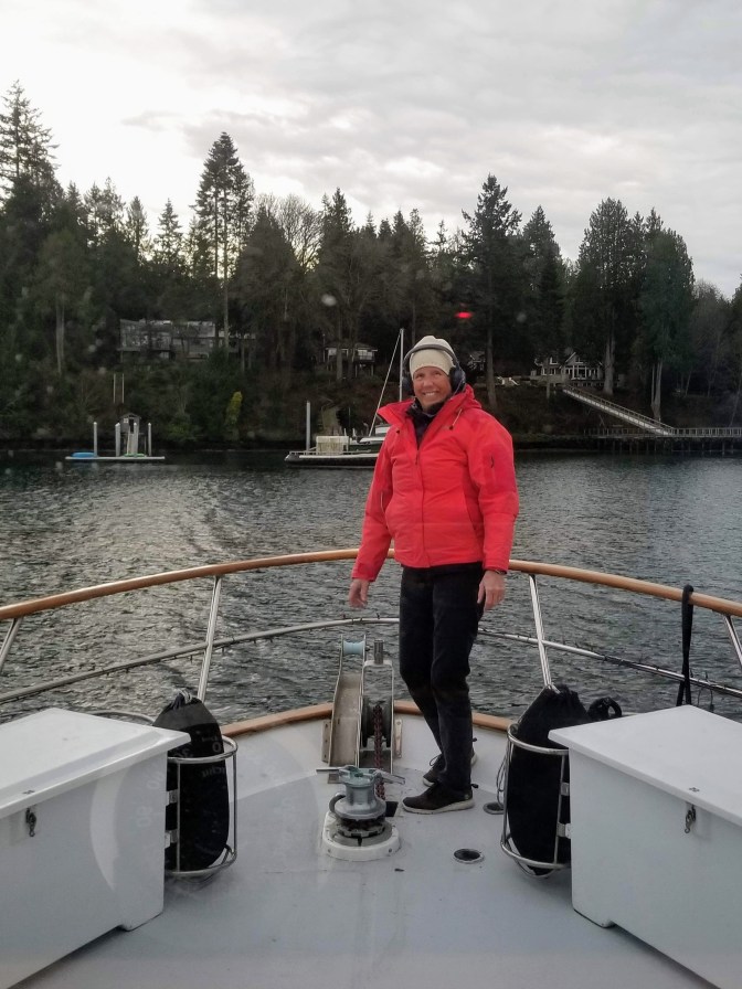 It all starts out simple enough. We were anchored in Gig Harbor for the night so we could pick up our new dinghy the next morning. After receiving the dingy our plan was to test it, then hoist it up onto its fly-bridge lair for the passage. In the summer we have been known to tow the dinghy for short passages in good weather, but do not like to do that during the winter months. As we sipped a postprandial tot of Josh Cabernet, we discussed about how we would make our way up North to our next destination: Anacortes for a winter haul out. With the shorter daylight hours of the late fall and winter in the Pacific Northwest, shorter passages are better than long ones. Twenty to 30 miles can easily be done during daylight hours. Also, passage planning tends to take on a bit more in depth analysis than what we do in the summer months. In the Pacific Northwest there is a saying: “If you don’t like the weather, it’ll change. just wait 15 minutes”. That seems to be even truer in the colder months.