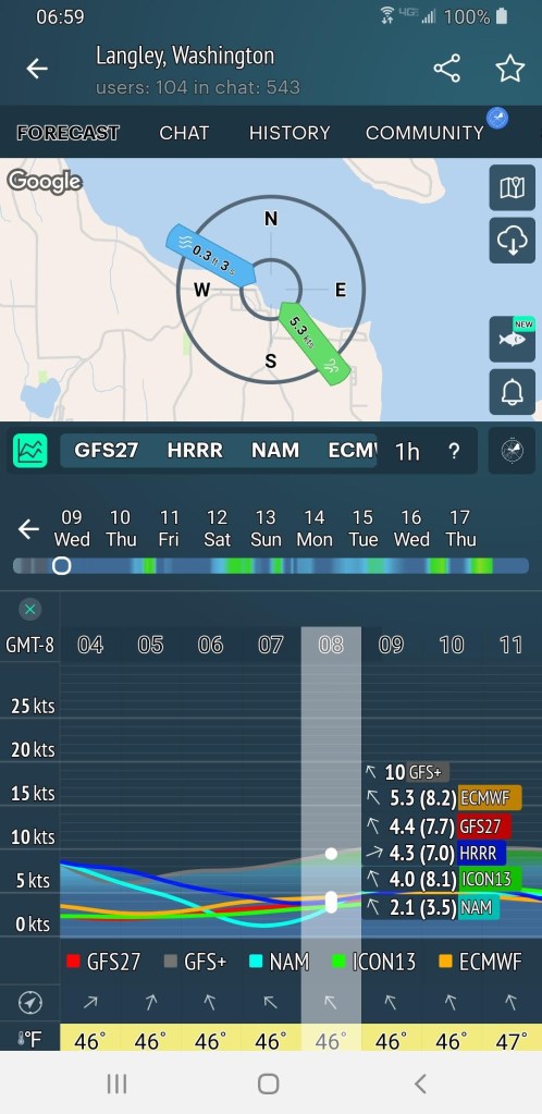 So, we quibbled, sipped, thought deep thoughts, consulted the data generators, and determined that Gig to Madison to Everett or Langley, to La Conner to Anacortes was the ticket to ride. Nice short passages with plenty of bail out options should the weather deteriorate.