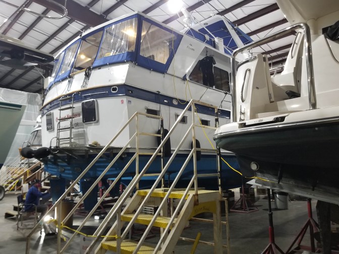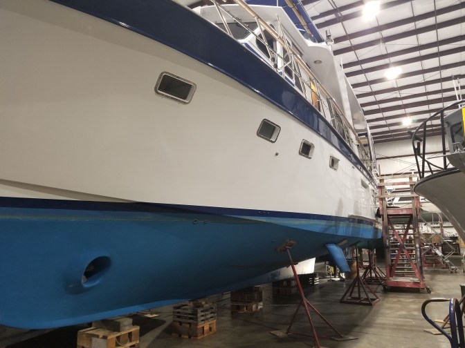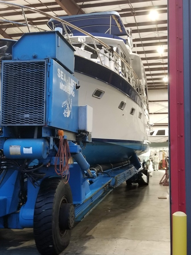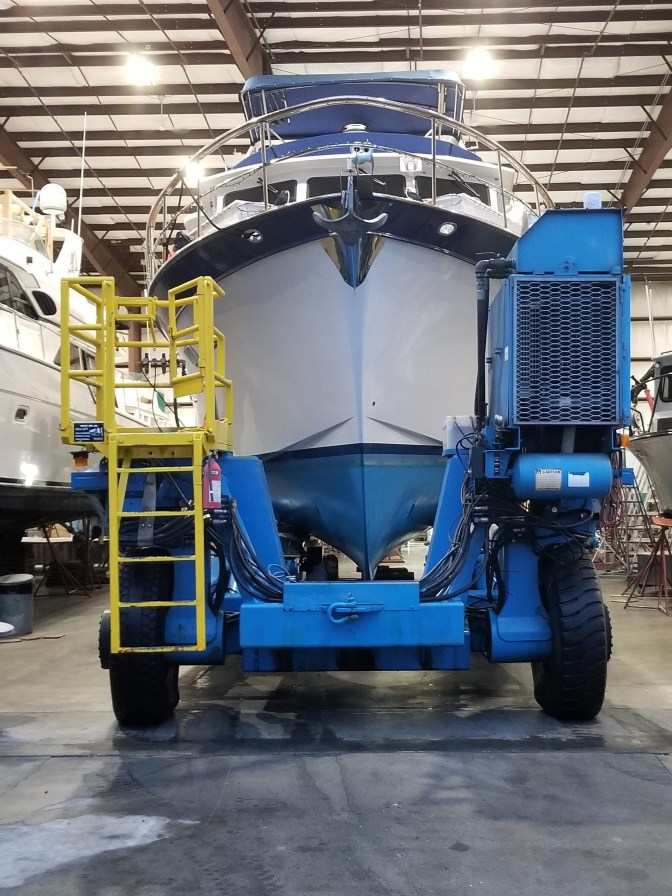 For the holiday season we decided to haul the boat out of the water to have a new crane installed to make it easier to lower and raise the dinghy from the fly-bridge deck where it lives. That and a few other things will keep us in drydock for the next couple of weeks. So…. we are currently “docked” on the “hard”, as it is known, with the boat up on blocks and held upright by supports, to keep it from tipping over. That would be bad.