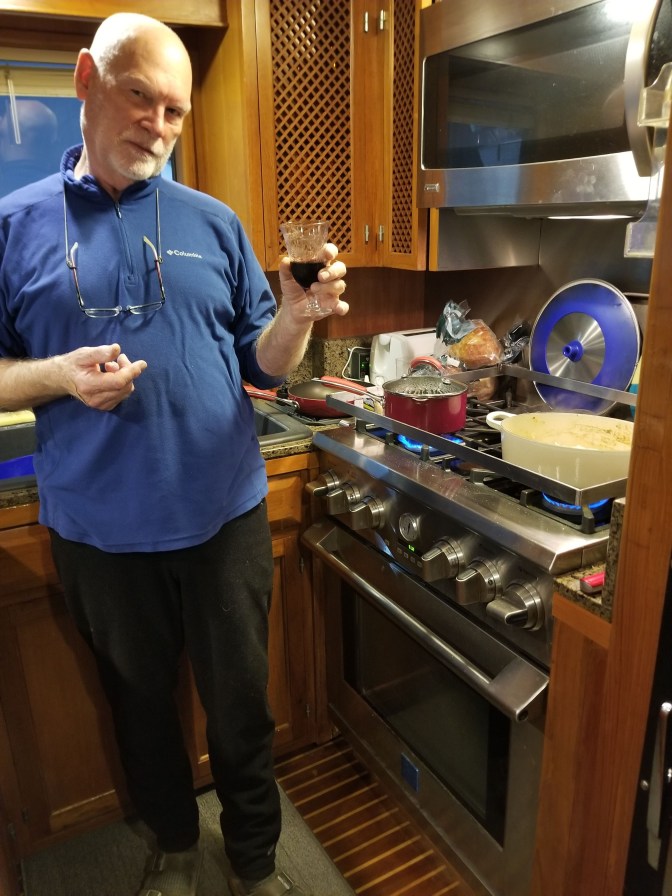 See… on the boat since we are inside we can’t use the sinks. Each sink has a bowl in it to catch water that we then dump into a 5 gallon bucket that we then have to carry down the stairs and dump in a sink by the restrooms. The restrooms are very nice, but walking through the dark warehouse at 0200 is not a very soothing adventure. And the damn bucket can get really heavy, so we only let it fill 1/4 or so. We can use the boat heads, but try to keep that use at night when wandering through the yard is less appealing; because in the yard, there is no way to dump the holding tank if it gets full etc. Every thing else works just fine. So… kinda weird for our holidays, but what’s new. We’re just kinda weird enough to put up with the vagaries of live-a-board life.