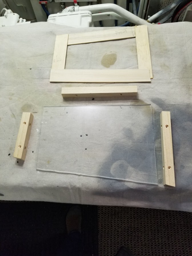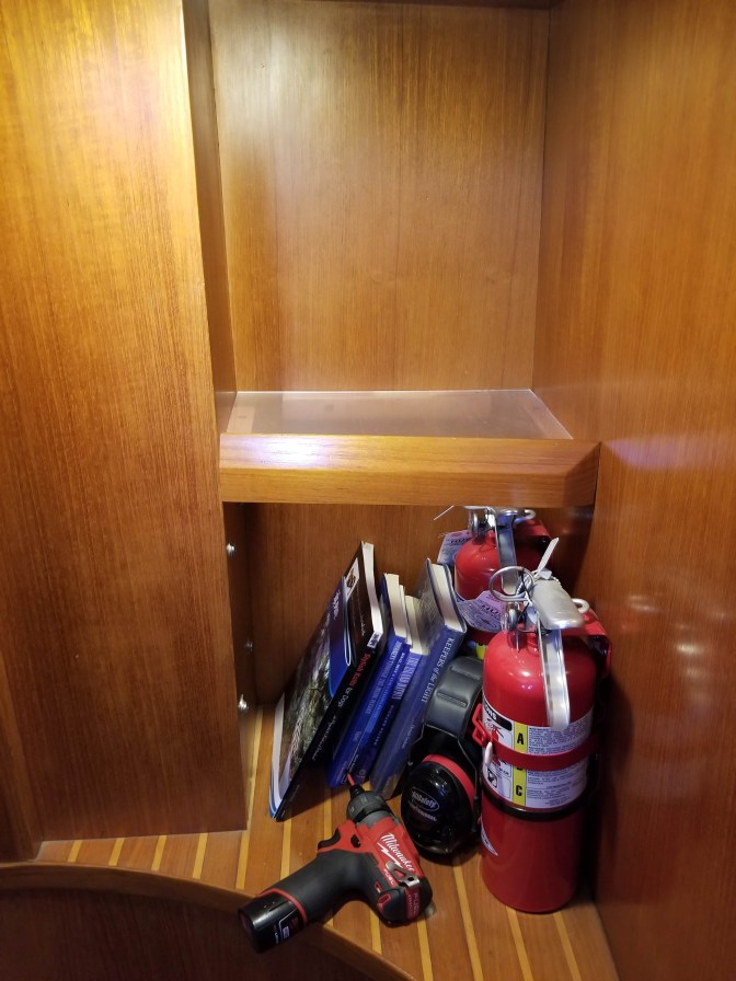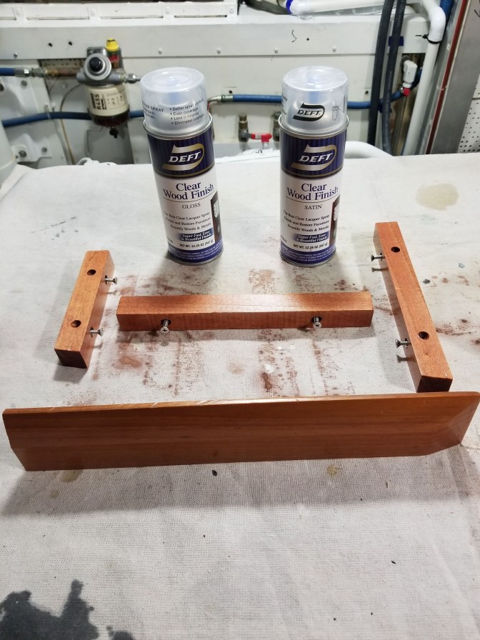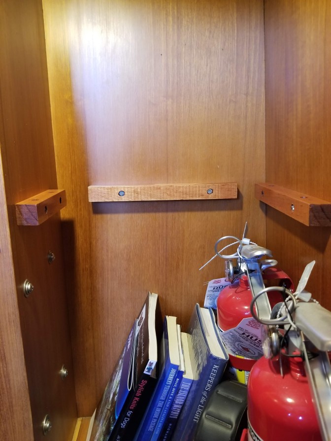 All told 4 hours or so of total work. The spray lacquer really speeds up application and dry times. Of course… the project was done on a boat… so the shelf is not square. That’s were the door skin strips and a glue gun come in handy. A carpenter friend in Oregon made up the strips for me 2 years ago and this project finished off that batch… I will be needing more…