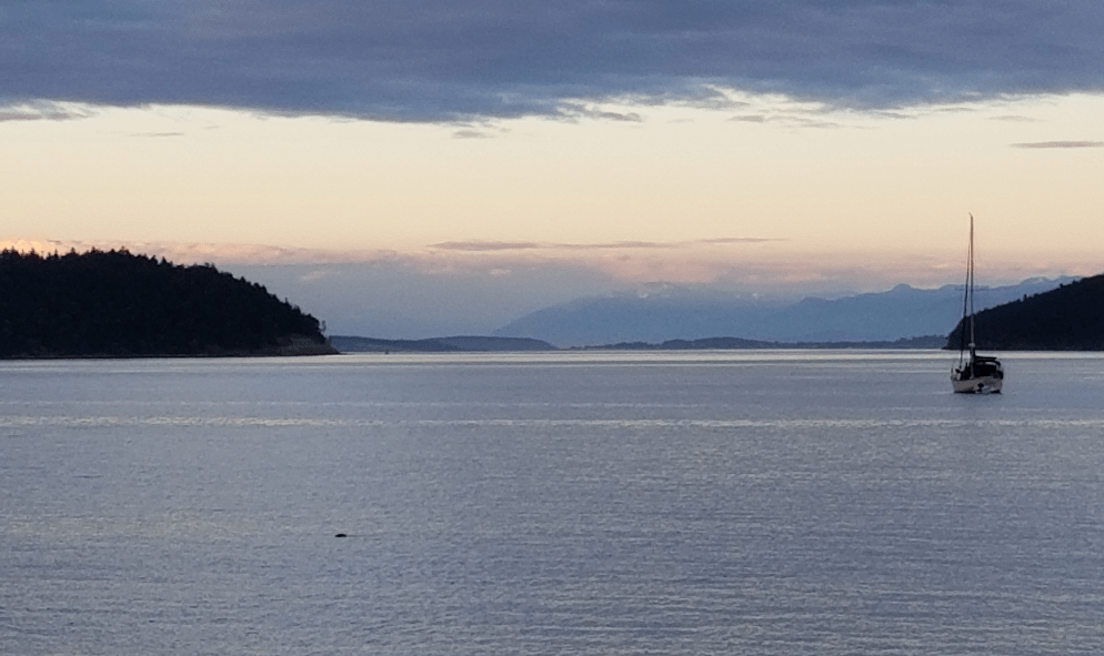 From left to right: West Shore of Lopez Sound, Spencer Spit State Park, Frost Island with Orcas Island playing the role of the brooding backdrop, a Washington State ferry, Blakely IslandA view back towards Hunter Bay. Two boats… just 2 boats… One of them houses John and LuAnne whom we’ve gotten to know quite well. They departed Hunter as well after we did, and ended up at Roche Harbor. The marina at Deer Harbor on Orcas was full. Imagine that…