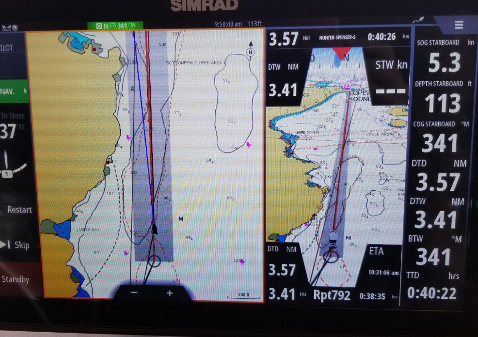 Taken at a point 3.57 miles from our destination. Speed 5.3 knots at the time. 40min26Sec to go. San Juan cruising at sailboat speed with all the comforts of home.