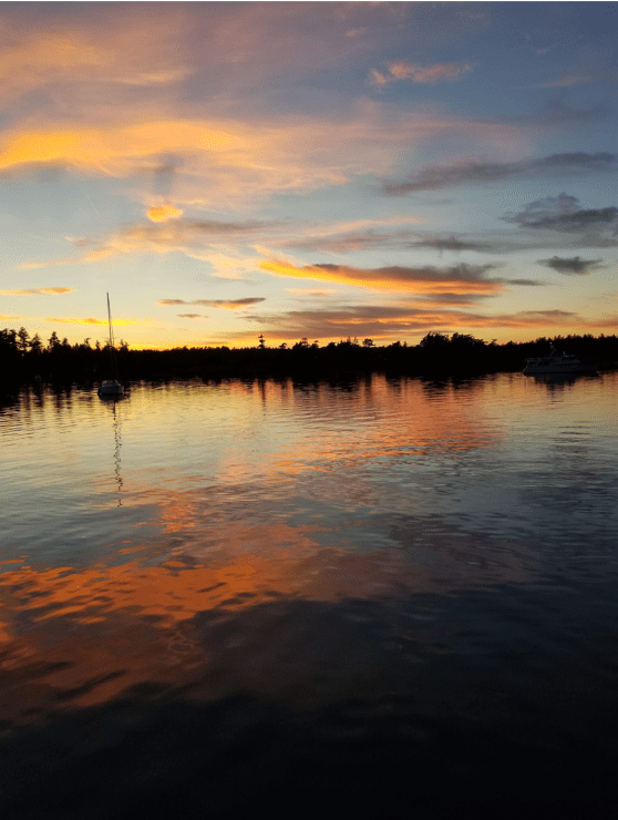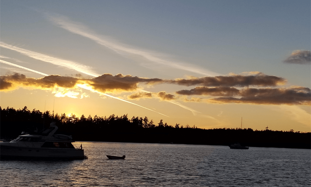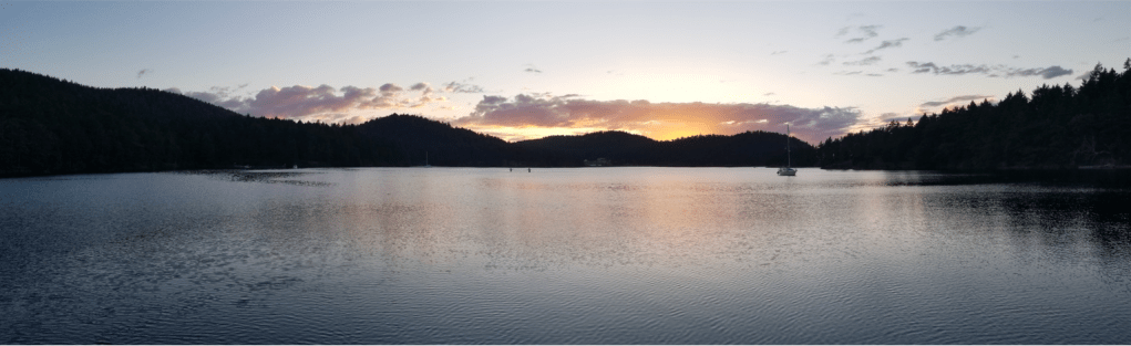 6/24/21, Garrison Bay just before sunset. One of our favorite anchorages… It has good holding and is safe in most wind conditions. British Camp was built in the 1800s and is now a State Park. Great trails, pear trees, place for geese to hang..