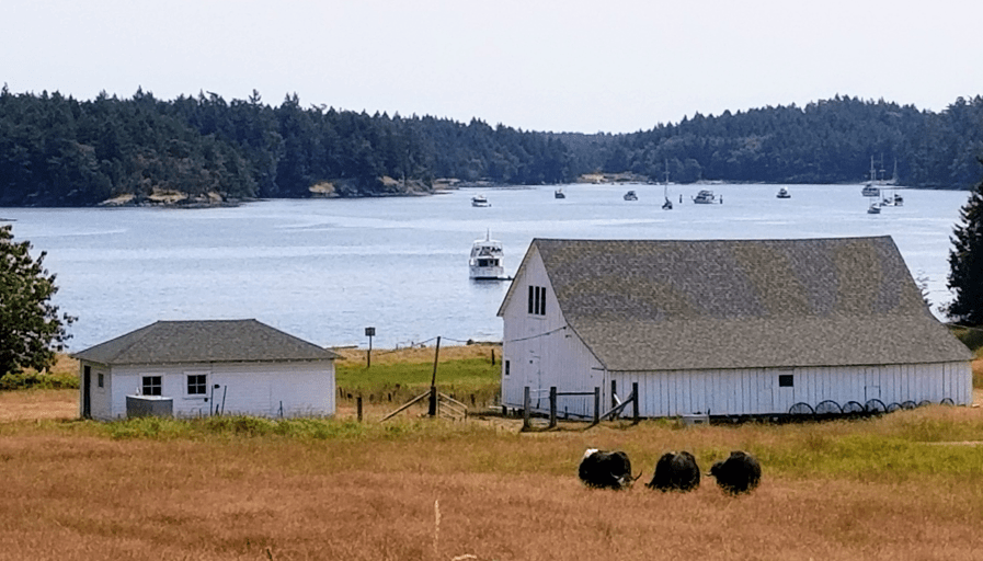 7.2.21. Next stop: Prevost Harbor, Stuart Island. The view from the Erickson Farm on the shore of Prevost Harbor, Stuart Island.What are these?The Girls… up close and personal.