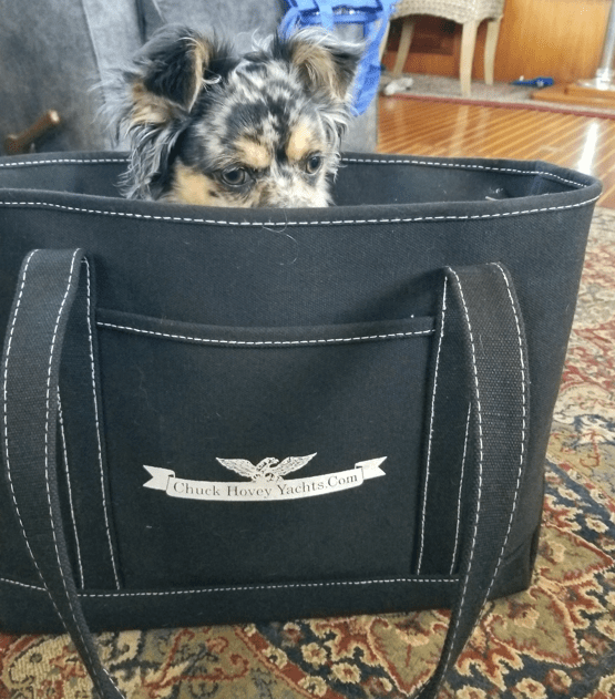 Collar removed. Stitches intact. Ready for travel. Dinghy? Stand up paddle board? Who cares… just get me off this boat! He is in his travel sack. We don’t put him there, he just gets in it and gives us a look…