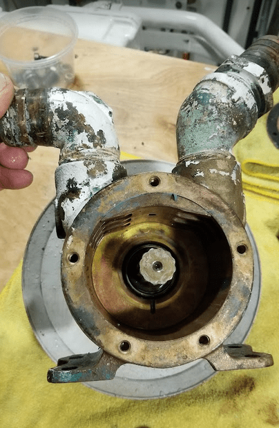 Corrosion on the spline: What you can barely see, and what I can’t take a better picture of with my cell phone… is that the 12 pointed spline that is enshrouded with metal to plastic co-polymer magic fins… is just fine. The impeller blades have memorized their most likely rotational position… kinda like the Monterrey pines you might see on Carmel Drive… or out at Westport or Tatoosh Island. Where the wind blows, the pines lean. A simplistic, mechanical marvel it is for sure…