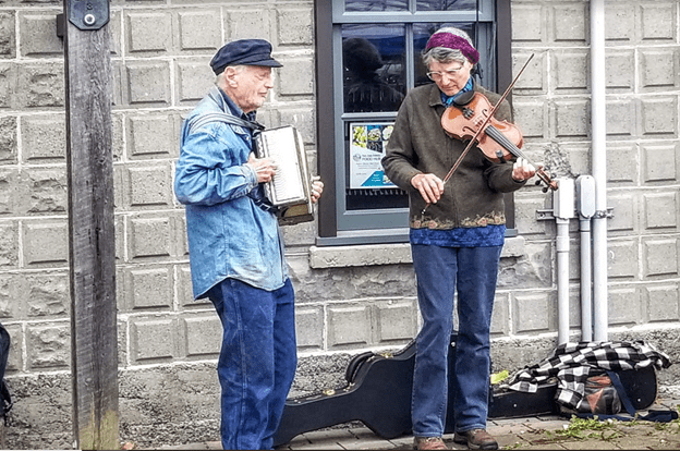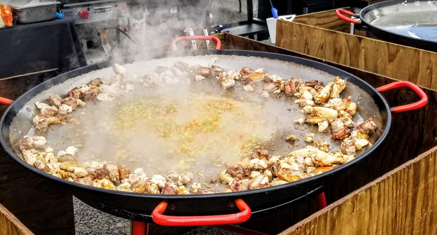 Not a whole lot of produce… it is a bit early yet and the weather has been rather cool… but what was there looked great! The collard greens and romaine… marrivillosa!There were several booths displaying baked goods. Bread, rolls of every kind cheezy, garlicky doo-dads. spinach, egg and Bree tucked between two flower tortillas… You name it, and if you can bake it, it was there.Now this is something I’ve never seen… This is the beginning of paella. Only the pan is six feet across and there were two of them going full bore. The line wound around the market… quite popular.The opening musical act. Fiddle and squeezebox. Nice.The rest of the band joined in for some great islander blue-grass.The indoor part of the marketHow to spice up baskets… spray em!Hand painted silk scarvesOur friends, Jim and Lisa who now own our last boat (small world)… and Les discussing a item of interest… uh… who knows. Lisa seems to be challenging Jim about the item to purchase, and he looks a bit dubious, eh? Farmer’s Market stuff… Hard tellin… I was way across the room.