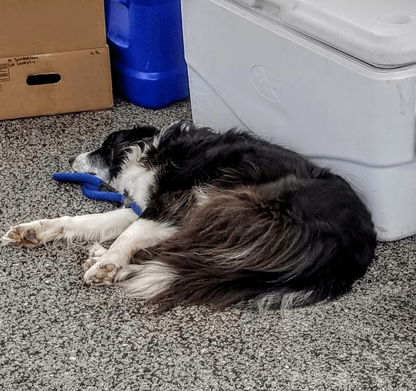 Border collies looking for something to herd. Maybe the pug, maybe the chihuahua, or the little kids running about This BC was so well behaved. Ground tied in the family booth. He either lay there with his head resting on his paws or sacked out completely. Saving energy up… there were chores waiting back at the farm.