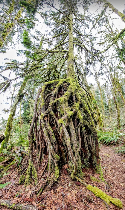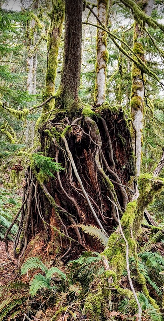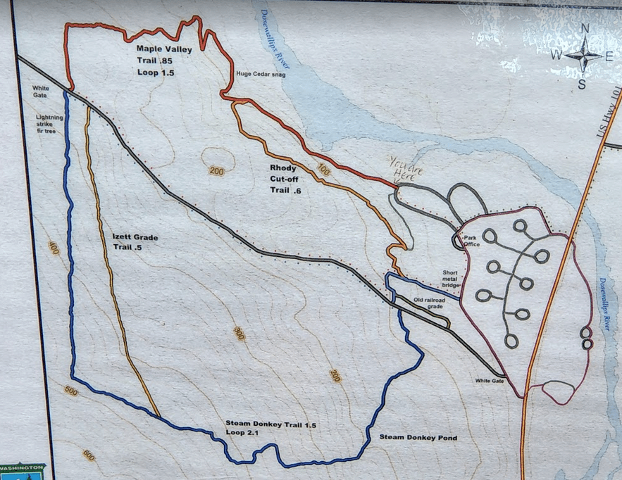 Les and I have become quite attached to hiking the local forests and are always looking for new trails to explore. Old logging roads abound in the PNW and many have become hiking trails. Two of them, the “Maple Valley and Steam Donkey Loop” in the Dosewallips State Park near Brinnon caught our eye. Just the name, Steam Donkey Loop, held a certain intrigue for us. Along with “Steam Donkey Pond, Huge Cedar Snag, Lightning Strike Fir Tree, Rhody Cutoff, Izette Grade” the relatively short distances and reasonable topo elevations… we were hooked.