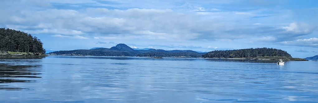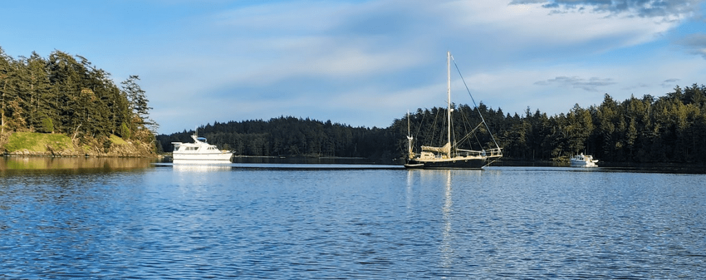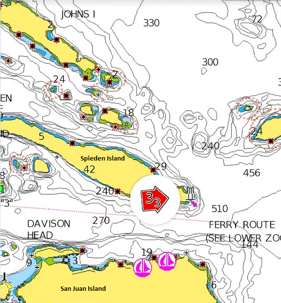 Our destination anchorage, Parks Bay, was quiet. Only two other boats were in the anchorage. During a leisurely postprandial conversation… we discussed amongst other topics, where we’d go in the morning. From Parks Bay, there are numerous, excellent places to anchor or pull up to a sturdy dock if re-provisioning, water or fuel are needed. The weather was going to be placid for the next 5 days or more. Wind protection was not an important concern. We weren’t in need of a sturdy dock or “topping off” anything. Morning currents favored traveling North and West from Parks, which led to the nomination of Prevost Harbor on Stuart Island as our next destination. It is one of our favorite anchorages and a mere 12.3 nautical miles (NM) away from Parks. And, if we left early enough, the powerful currents around Spieden and Johns Islands would be flowing with us, not against us. The navigational conundrum concerning the Speiden Channel and its patch of islands, reefs and rocks, once you’ve laid a course to avoid hitting anything hard, is to time your transit to take advantage of the currents that can easily attain velocities up to 5 knots. In your face or in your favor. You decide.