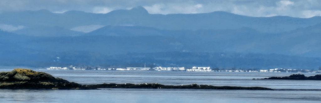 09:20: Leaving Limestone Point on San Juan Island, far off our port side, and looking down Spieden Channel, I took this picture of Sidney, BC, just 12 nautical miles away. We will check into Canada at the Sidney customs dock soon.