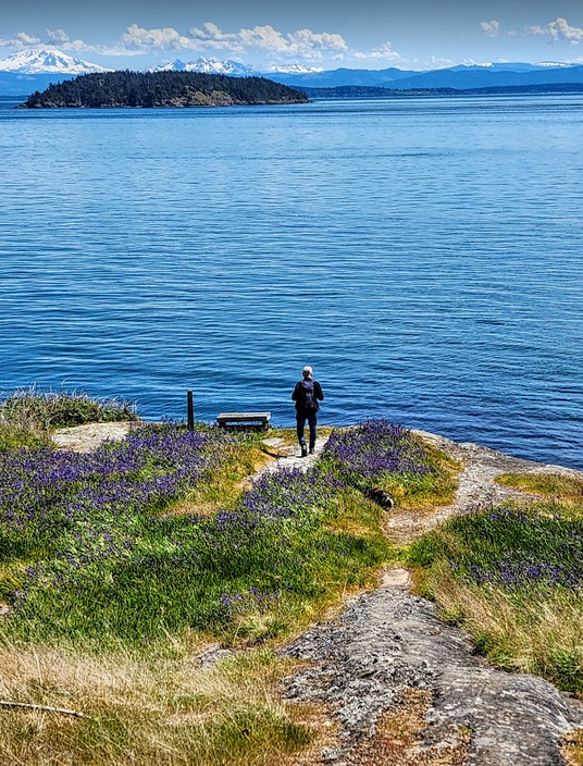Hiking out the steep trail to Johnson Point… Snoring Bay on the right, Orcas Island in the distance.