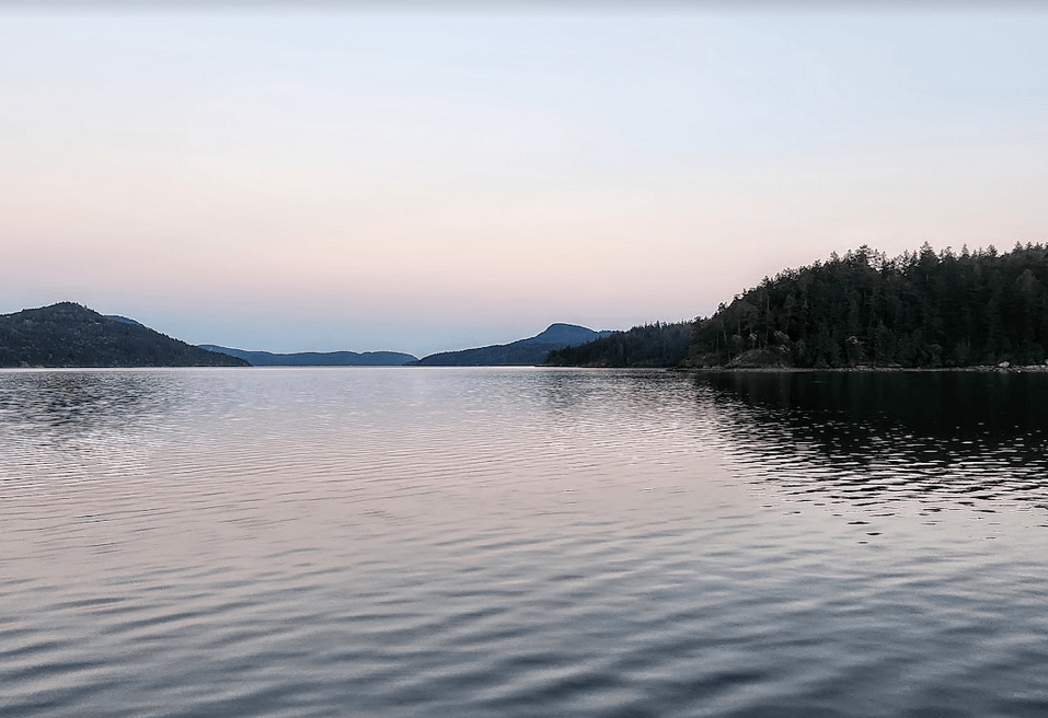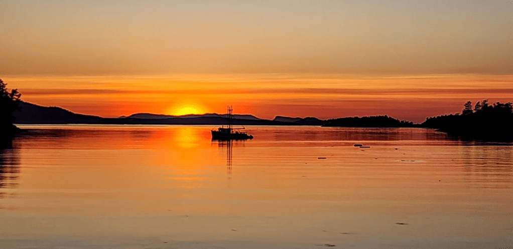 The evening view off the stern from our anchorage at Judd Cove, East Bay, Orcas Island