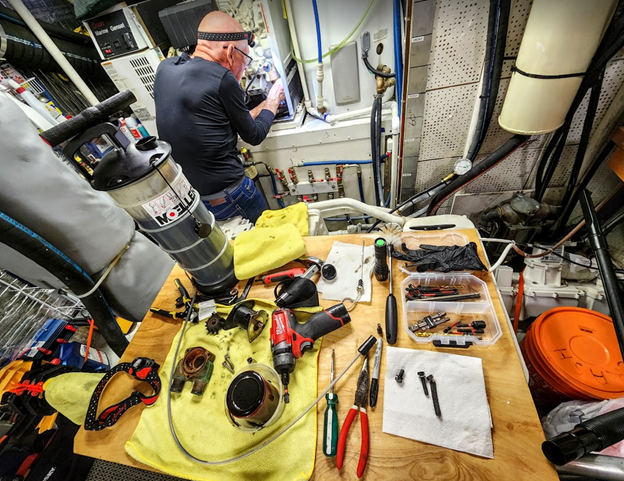The next morning found me ensconced in the engine room surrounded by my favorite dismantling tools:
