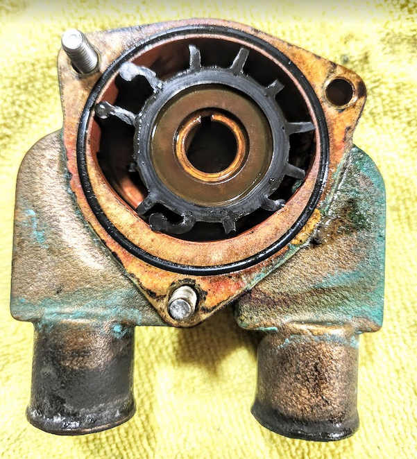 After finding the water pump impeller in shreds… I then had to get to the heat exchanger and retrieve all the broken vanes that were sure to be there blocking future water flow. To do that I had to remove the oil filter. That’s right. Some silly engineer type put that right in the way. So: empty the oil from the engine, remove the filter, remove the end cap of the heat exchanger and remove the bits and bots that were not supposed to be there: