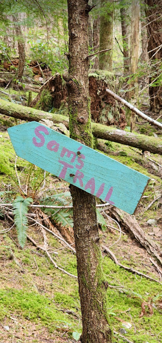 There are some great trails that terminate on the shores of Carrington Bay. Some of them are old, repurposed logging roads. Many other small tributary trails crisscross the area. Some appear well traveled. Others are nearly inperceptible, wispy, tendrils that meander through the salal, moss and second growth forest. Sam’s trail was one of those. It did have the luxury of having a few signs at important turning points. Signage elsewhere in that forest is… meager at best. But what a great place for a nature hike…
