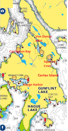 Our malleable plan for Cortes, was to execute a clockwise circumnavigation of the Island, stopping at several anchorages along the way. According to the guide books and Active Captain entries in our Navionics program, the first two locations with reasonable anchorage were Quartz Bay and Carrington Bay. Carrington came up first, and as we approached the inlet of the Bay, we went in for a recon. Sources state that the bay is not noted to be an anchorage of refuge because it is open to the Northwest. It looked great to us, and the weather was exceptionally calm, and the bay was gorgeous! The cruising guides mention that there are up to five locations to consider for anchoring. The “SalishSeaGuide” paints the best picture: