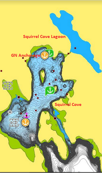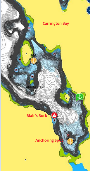 Anchoring sites 1, 2, 3, and 4 all claim to have rocky bottoms. Not my favorite choice for anchoring. Site 5, close to the Carrington Lagoon entrance boasted a bottom made of mud and gravel with a few rocks. That’s where we chose to anchor. When backing down on the anchor… we could feel it skipping over some rock, but the anchor caught, held nicely, and kept us in place for 3 days. After anchoring I always turn on my two programs that warn me via alarms, if I’m drifting away from the location that I anchored. No issues noted during our stay. When we hoisted anchor… the chain and anchor were clean. No mud… Due to that… I’d have to state that anchorage 5 is mostly rock. That being stated… the location was stunning. The weather was benevolent. So… whatever mischief was lurking in the rock, mud and gravel… our 110 pound Bruce claw anchor and 200 feet of heavy chain kept us in place.