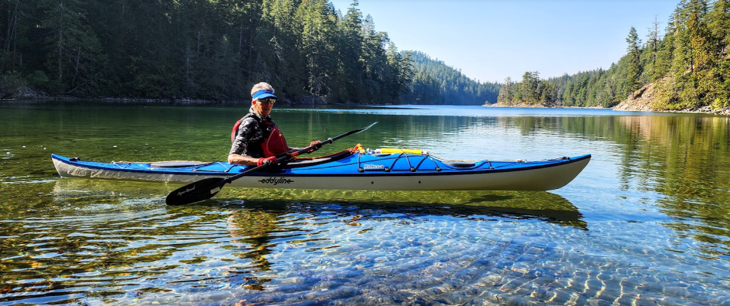Les put on her determined face. That look is something to behold. I’d seen it so many times while she was competing in dressage, or training a 1500 pound, 17 hand Dutch warmblood. The look clearly signals determination and inner strength. She started paddling against the current, testing the eddies, slowly making her way up to the the crux move where the smooth water still pouring in from Squirrel Cove started tipping into the lagoon. The current against was greatest there. I was slowly paddling the eddies about 15 feet behind her. Her bow started slewing to the left. I shouted out for her to steer to the right. She did, and really put the power on. I shouted out: “Paddle or die”! She laughed, got through the crux and kept paddling. I followed right behind her back into Squirrel Cove.