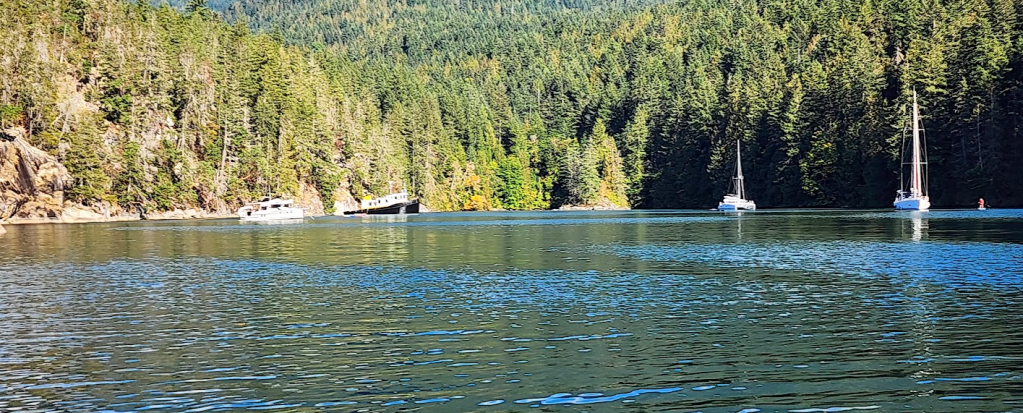 So… that’s that, and no harm done. To us, Prideaux is another pretty face amongst other pretty and prettier faces in Desolation Sound and the Discovery Islands. We stayed one day… and left, after deciding that we preferred, Waiatt Bay, Carrington Bay and Von Donop Inlet for their equally exquisite visual accoutrements, but more for their feeling of remoteness and “pristine”.