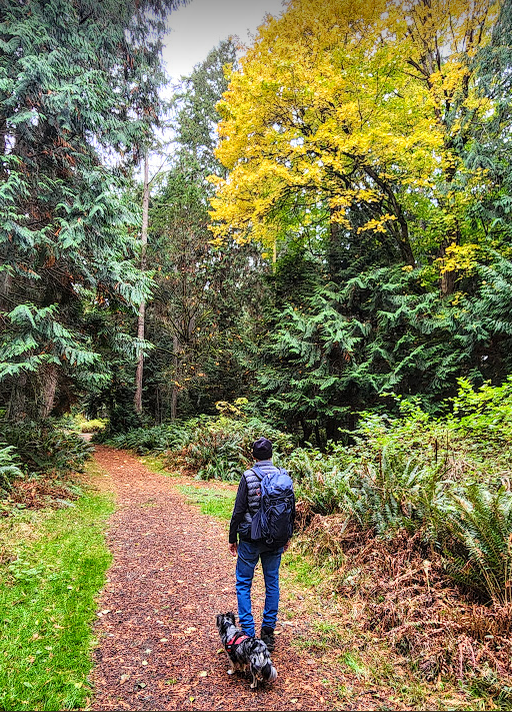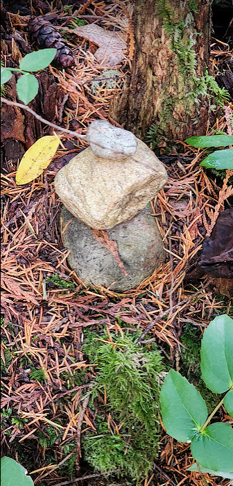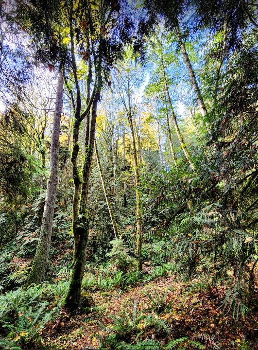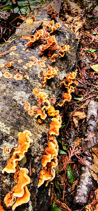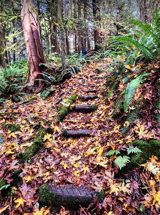 The environment at this time of year, is bathed in intermittent sunlight filtered through a mixed deciduous and evergreen tree canopy that is in the throes of shutting down for winter. Deciduous tree leaves are changing color and are falling to the ground. The trails are carpeted with them. Roots and rock obstacles are hidden at times. At least there is more light to detect them as the canopy above thins. More of the ethereal light penetrates to the forests floor.