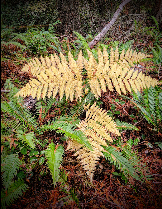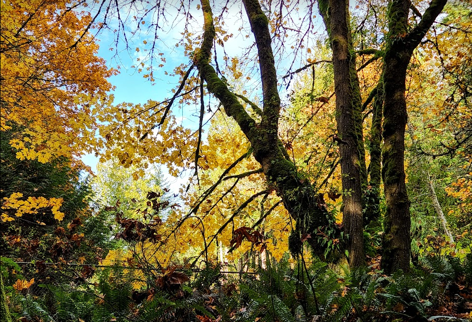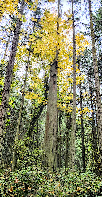 As the forest slows down it exhales a woodsy perfume: a lush, olfactory brew of evergreen terpenes suffused with a sweetish trace of maple sap as the maples move their winter energy sources into storage. The dropped leaves of the red alders, maples, red cedar and smaller bushes that are piling up on the forest floor add the tang of organic decay to the aromatic mix. And… the scent of “mushroom”, provided by their airborne fungal spores adds a final elemental fragrance. Pheromones abound. If only we could “read” them. Perhaps some day…