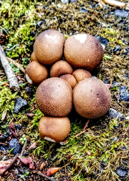 Quite common, a Lycoperdon perlatum (or L. pyriform). Whatever… by any other name it is a puffball. Now to be clear on this… Lycopoerdon in Greek means “wolf fart”. So there. These start out a nice whitish color and brownify over time. Eventually a small bump appears on the top and… as it matures the bump, an “apical pore” opens up and the shroom farts out its bevy of spores. Elegant solution, eh? Nothing like having farting shrooms in the countryside… Excellent topic for small talk around the dinner table… when the usual topics have been covered…