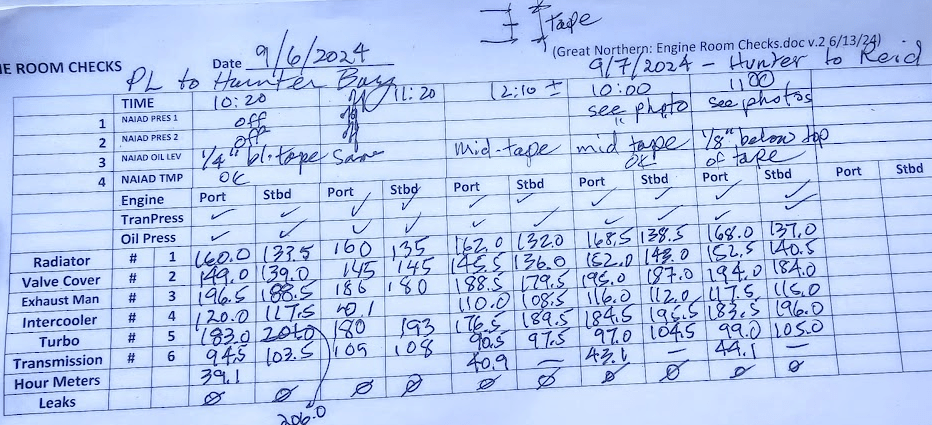 A bit compulsive you say? Could be. Then again. It is the responsibility of the Captain and Admiral to get from departure to arrival safely and efficiently. Serially documenting engine temperature temps can show meaningful trends that might point out impending issues that an engine water temperature gauge won’t. Example: A 10:20 starboard engine turbo temp of 201 degrees is clearly out of the ordinary, but certainly within the range of temperatures that turbos are exposed to. Explanation: That temp occurred when I bumped the throttles to get through the shipping lanes in Admiralty Inlet. A 950 foot container ship traveling at 19 knots in Admiralty Inlet pointed in our direction. It was in the shipping lane. We were crossing the lanes. The GPS and AIS systems calculated that our closest point of approach (CPA) was reasonable, but bumping the throttles up a bit brought us to a steady11.5 knots. I maintained that speed until the CPA reported on the chart plotter started to increase. It was a 4 or 5 minute spurt. This explains the increased heat in the turbos. The port engine (Fred) is always a tad higher that the starboard engine (George) because the port engine also runs the pump that provides hydraulic pressure the the NAIAD stabilizer system. A discussion with a mechanic is warranted, but… I suspect it isn’t a problem… That being said, I do have the data for a mechanic to review. And, we have years of data. The other important pieces of the hourly checks will expose: Fluid leaks, fraying belts, transmission pressures, etc… all things that need to be addressed before somthing bad (and expensive) occurs. By the way, just soze ya noze, the Admiral (Les) performs 90% of the engine room checks.
