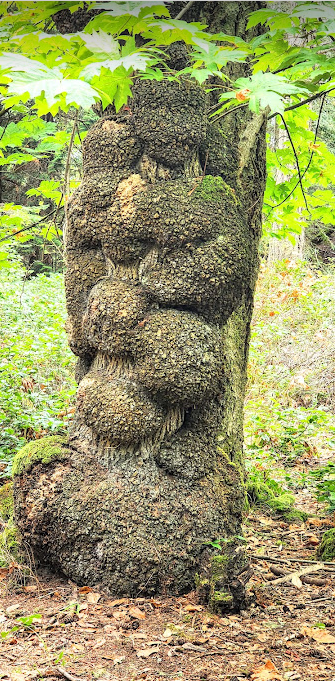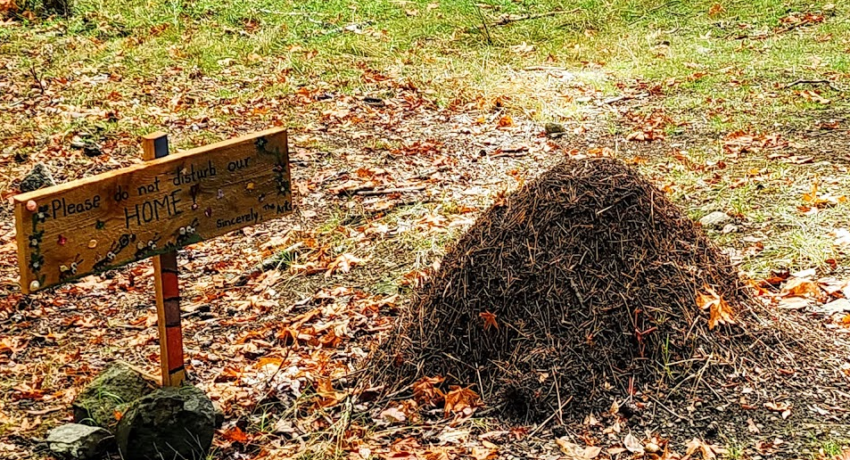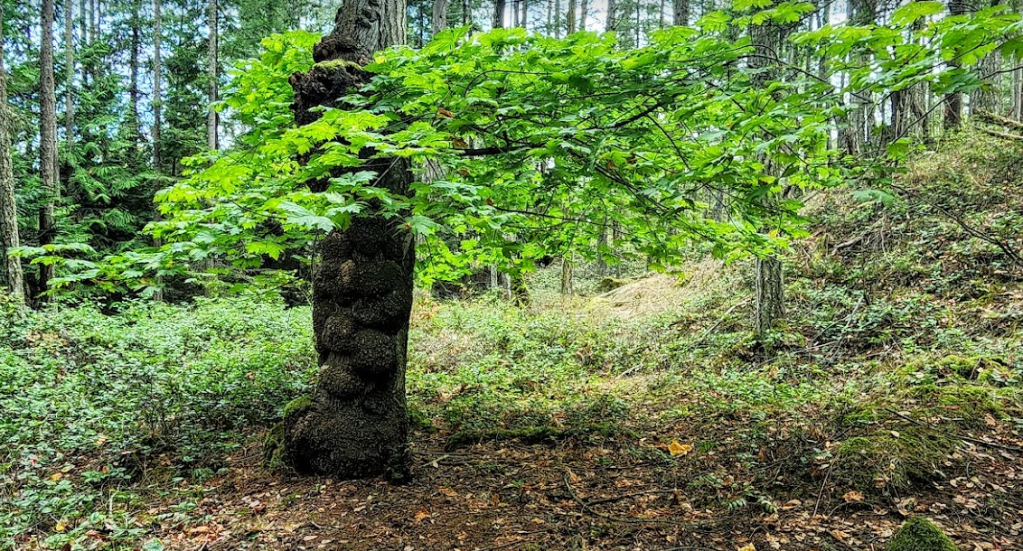 Bolstered with calories and coffee, and taking advantage of stellar fall weather, we went on a hike: State Park dock to the Turn Point Lighthouse and back: 6+ miles. Up / down trail with rocks and roots with gravelly roads in between. It is one of our San Juan favorites: Our route takes us through the park to its Western boarder. An interesting side trail in the park led to: