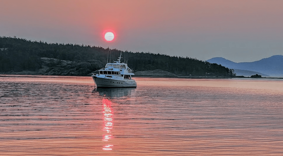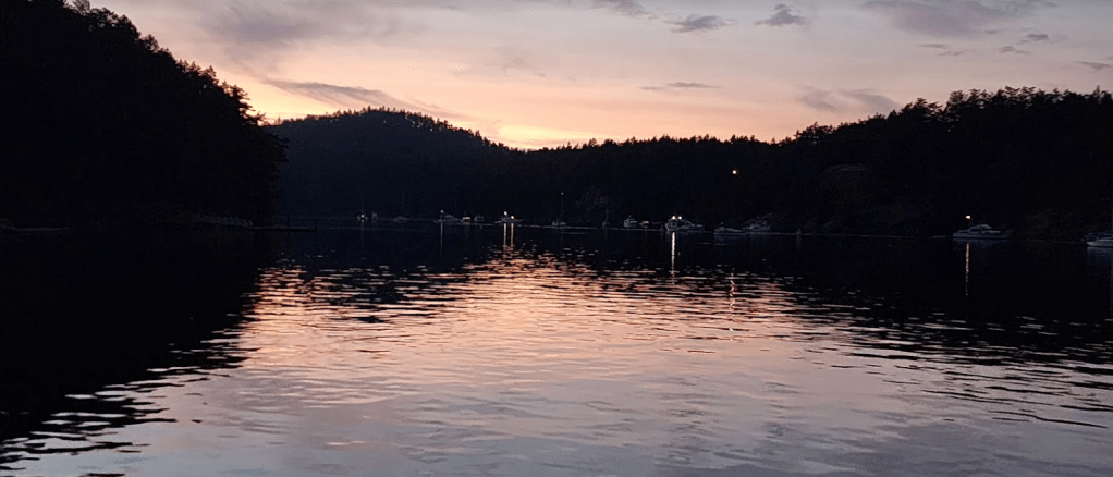 Hunter Bay as our usual first destination when motoring to the North from Port Ludlow. It is a mere 5 hour cruise from Port Ludlow, and a wonderful anchorage. It’s not the best place to be in strong Northerlies, but it is seldom crowded. It meets all the desired check list items of our Hudson Bay Rule. Anacortes is only 12 nautical miles away where fuel, chandlery, marine technicians, divers etc. are available. So, if something goes awry or we forgot to bring something along… it will be available there. And… it has sunsets and sunrises covered: