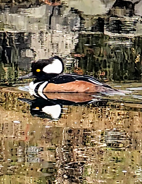 Its a male Hooded Merganser in winter, mating plumage. Quite common around Ludlow in winter. They generally hang in Alaska on the West Coast, and the upper Atlantic coast. They winter as far south as Southern Oregon or on the East Coast, all the way to Florida. Their courtship dance is great fun to watch…