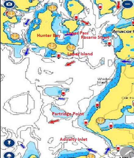 At the time this snap was taken during our voyage, we were transiting the Eastern end of the Strait of Juan de Fuca, and were about halfway between Partridge Point by Admiralty Inlet and the San Juan Islands. The gap towards the right third of the picture is Rosario Strait. We swerved up that Strait for a bit, then hung a left into Lopez pass, transited the waters of lower Lopez Sound, and settled into Hunter Bay for the night. Cozy it was. We were the only boat occupying one of our favorite anchorages.