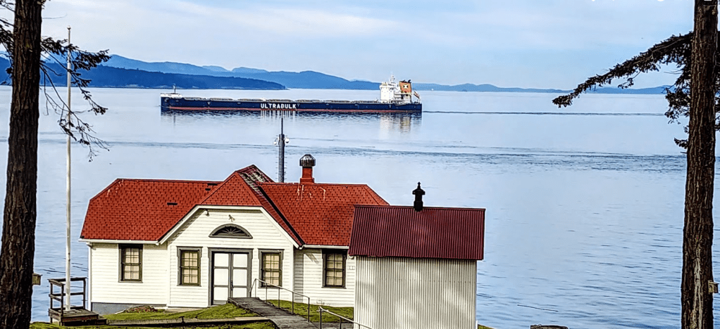 And of course we hiked the 6 miles out to the Turn Point Lighthouse and back. There were lots of eagles out there, but our snaps were a bit too out of focus to share… But as we were snacking on our traditional shared Cliff Bar and gazing about, the lighthouse and a passing ship were there for us to enjoy. The waters are Haro Strait. Canadian waters and the Gulf Islands are the background. Our next voyage out there will be to transit into Canadian waters and the pleasures they provide…